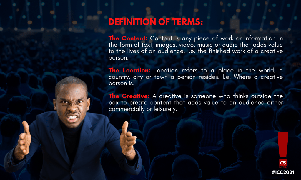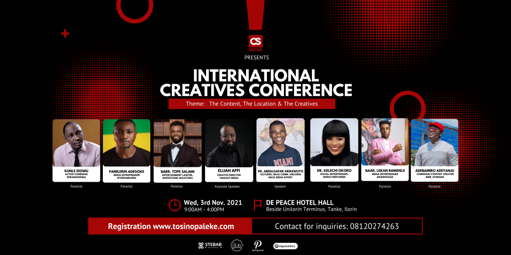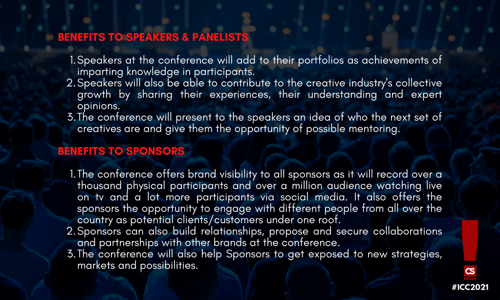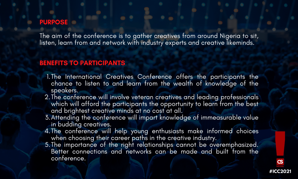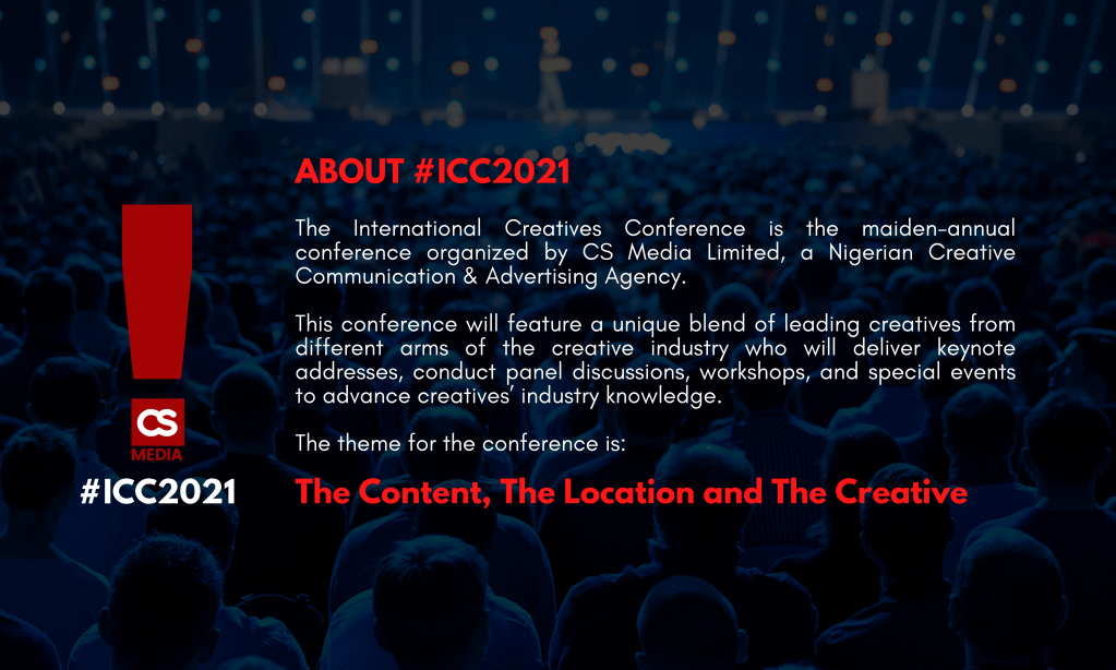 The International Creatives Conference is the maiden-annual conference organized by CS Media Limited, a Nigerian Creative Communication & Advertising Agency. This conference will feature a unique blend of leading creatives from different arms of the creative industry who will deliver keynote addresses, and conduct panel discussions, workshops, and special events to advance creatives’ industry knowledge.