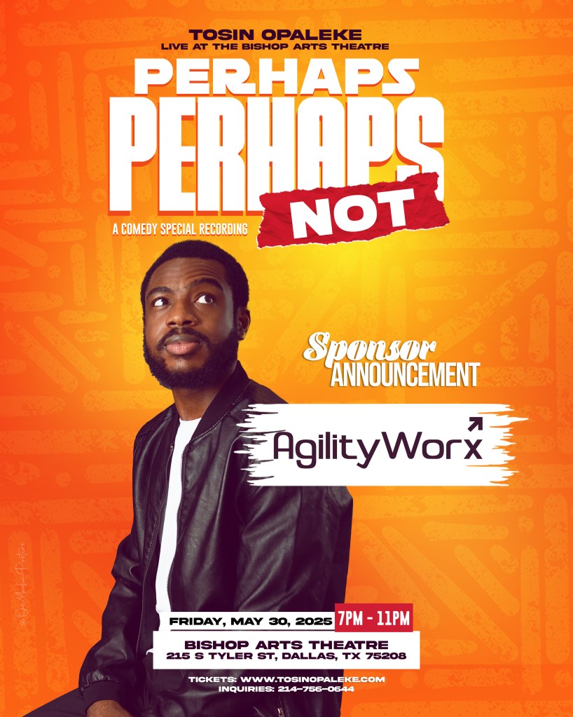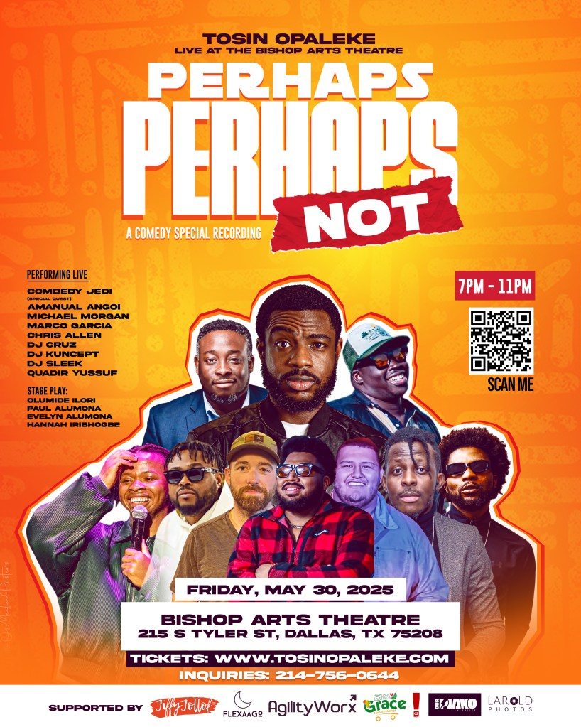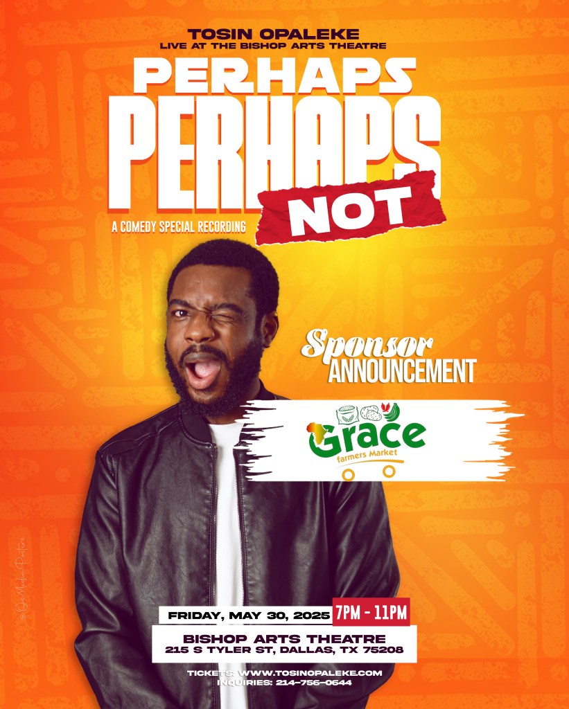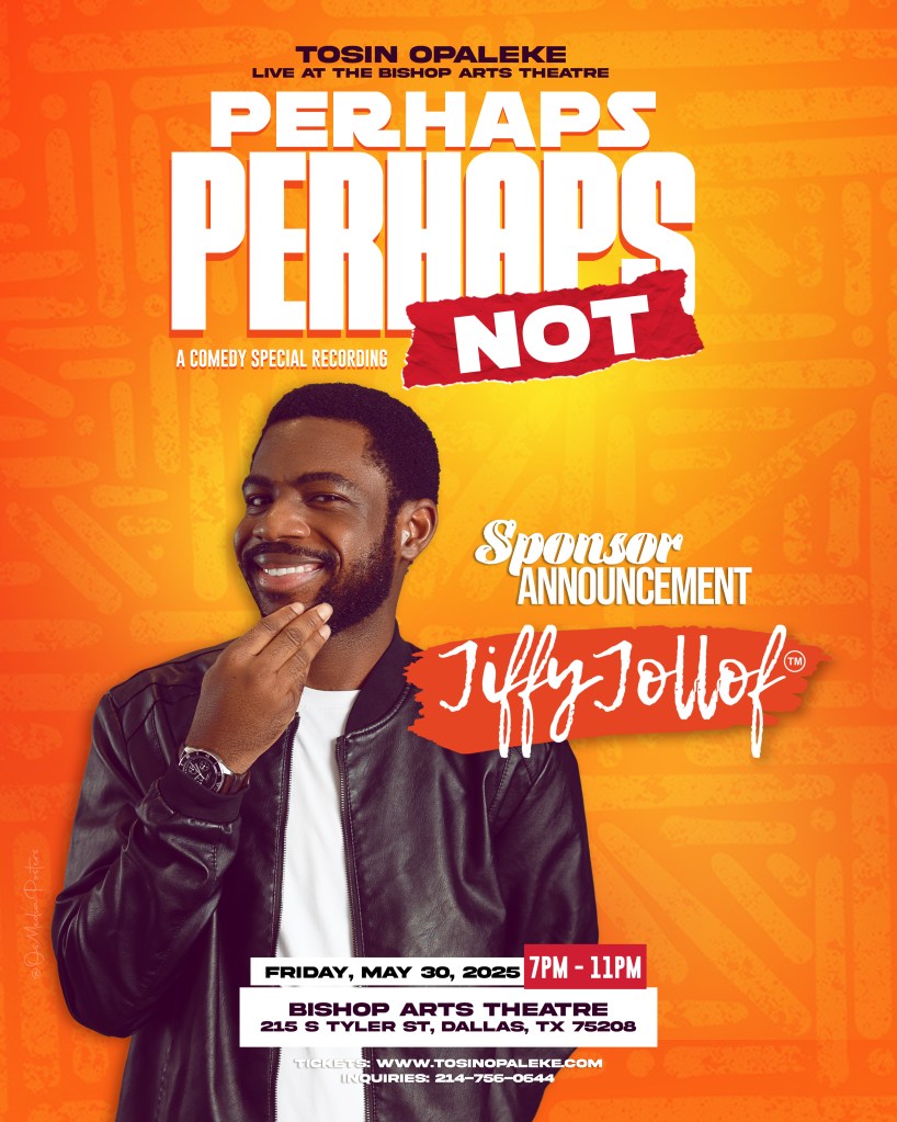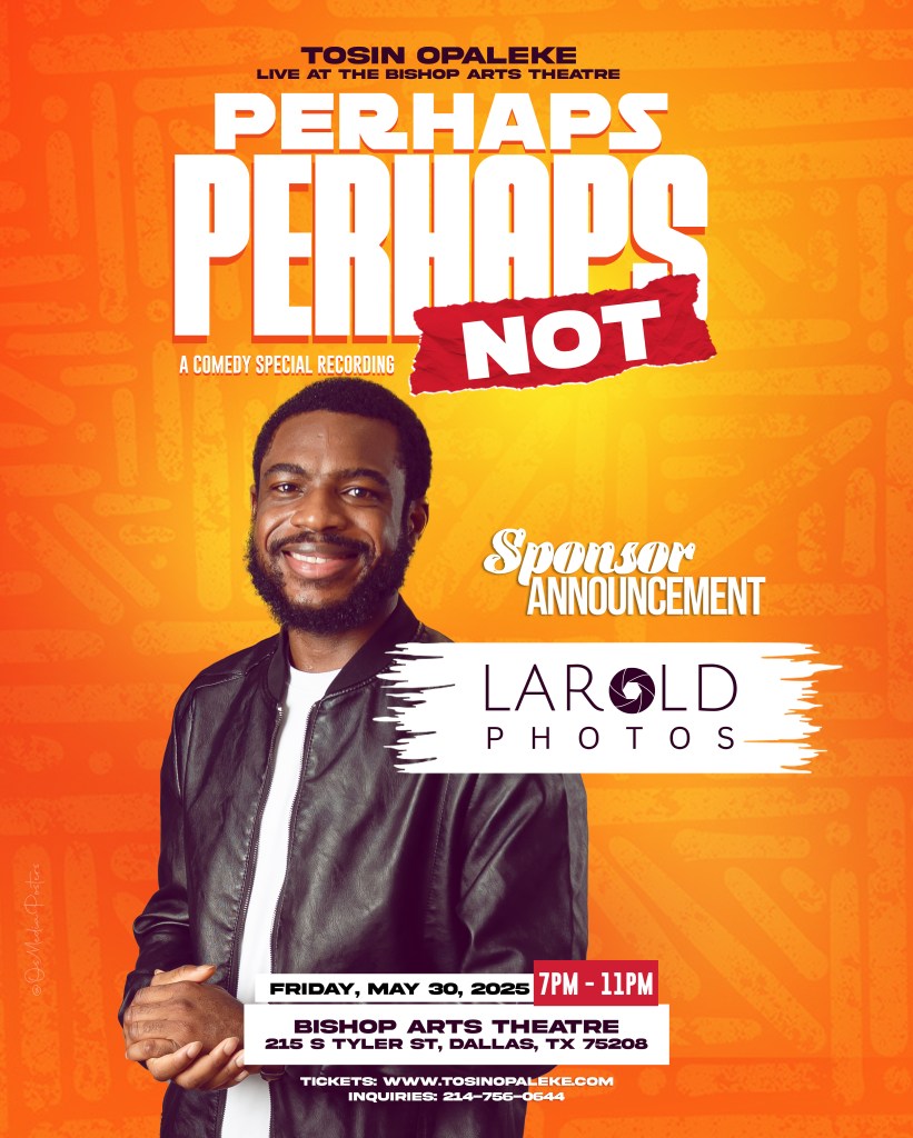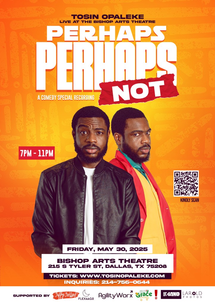 Tosin Opaleke Live at the Bishop Arts Theatre – PERHAPS PERHAPS NOT is a comedy routine that dives into the heart of today’s most pressing topics with Tosin Opaleke’s signature wit and charm. From the complexities of stereotypes and the struggles of immigrants to the peculiar things he has learned over the years of hosting events. Tosin put up a great show!